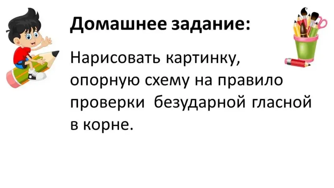| 9. Домашнее задание | - Творческое задание на дом. Придумать картинку, которая бы отображала правило безударной гласной. Можете объединяться по 2-3 человека. - Оцените свою деятельность в виде смайлика-Спасибо за работу. Урок окончен. |