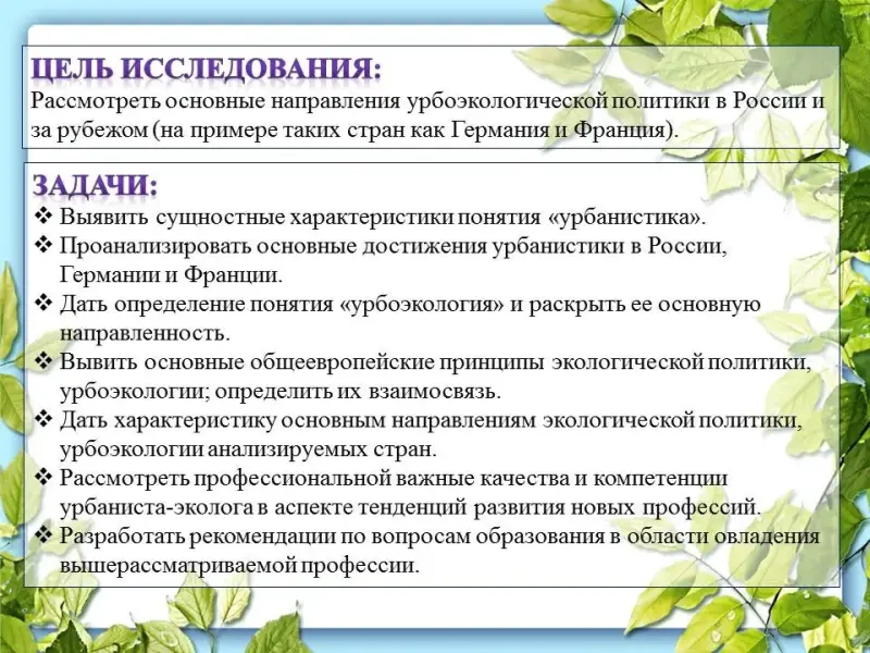 Цель проектной работы: рассмотреть основные направления урбоэкологической политики в России и за рубежом (на примере таких стран как Германия, Франция)