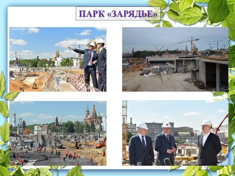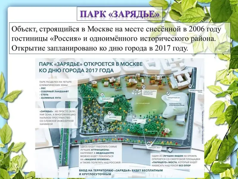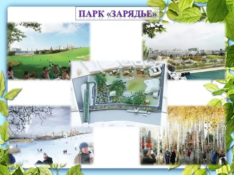 Парк «Зарядье» - уникальный объект, строящийся в Москве на месте снесенной в 2006 году гостиницы «Россия» и одноименного исторического района. Открытие запланировано ко дню города в 2017году. 20 января 2012 года премьер-министр РФ Владимир Путин указал мэру Москвы Сергею Собянину подумать над созданием парковой зоны. В 2012 году было создано общественное движение «Друзья Зарядья», которое начало отстаивать идею создания парка.