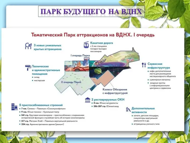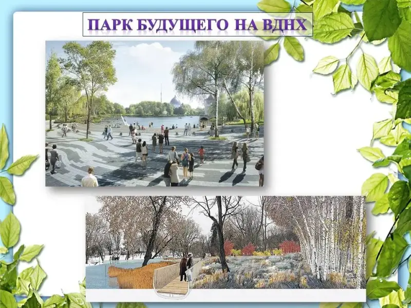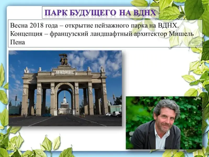 Для нас представляет интерес задумка французского ландшафтного архитектора Мишеля Пена. В данное время Москве на территории ВДНХ между Ботаническим садом, Останкинским парком и главными выставочными павильонами строится настоящий парк будущего, который будет разделен на пять природных зон. Все они будут под открытым небом.