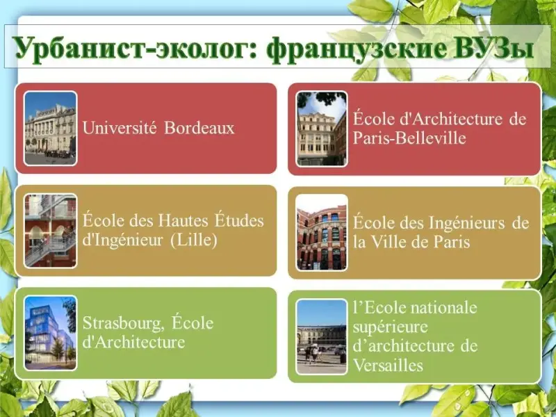 В европейских странах существует большое множество университетов, предлагающих обучение по данным направлениям. Франция не является исключением. Самымы известными вузами, в стенах которых встаю на ноги будущие специалисты в области урбоэкологии являются École des Hautes Études d'Ingénieur, Университет Бордо, École des Ingénieurs de la Ville de Paris.