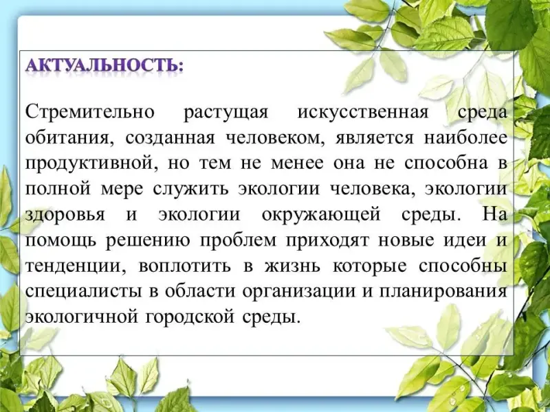 Урбоэкология, «зеленые инновации» являются на сегодняшний день ключом к решению насущных проблем, требующих не только заявленного профессионализма от специалистов будущего, но и совершенствования