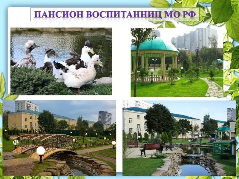 Пансион воспитанниц МО РФ является примером грамотного и правильного проекта, основанного на принципах урбоэклогического города. Над созданием парка Пансиона воспитанниц МО РФ работала дизайн-студия «Артпланнер». Необыкновенно креативная работа этой студии доказывает, что и в нашей стране быстро развивается урбоэкология, и в скором будущем работы наших специалистов будут соперничать с европейскими проектами. На территории пансиона можно увидеть как свободно гуляющих животных, так и жилые корпуса, что показывает неразрывную связь между природой и человеком.