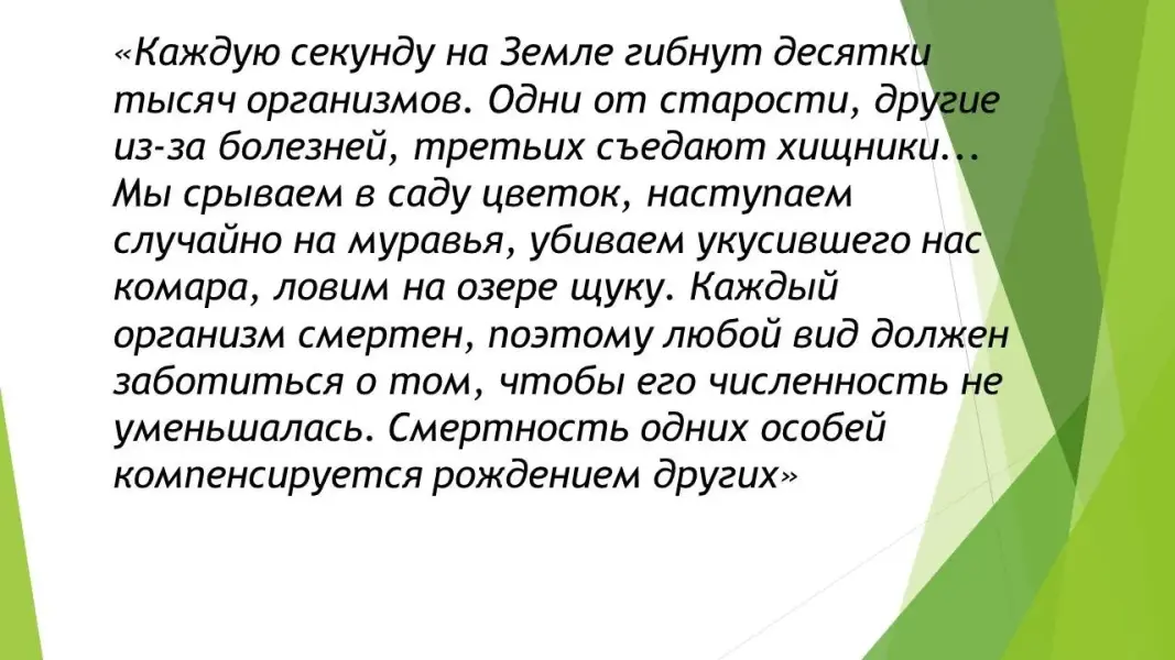 "Каждую секунду на Земле гибнут десятки тысяч организмов. Одни от старости, другие из-за болезней, третьих съедают хищники... Мы срываем в саду цветок, наступаем случайно на муравья, убиваем укусившего нас комара, ловим на озере щуку. Каждый организм смертен, поэтому любой вид должен заботиться о том, чтобы его численность не уменьшалась. Смертность одних особей компенсируется рождением других"