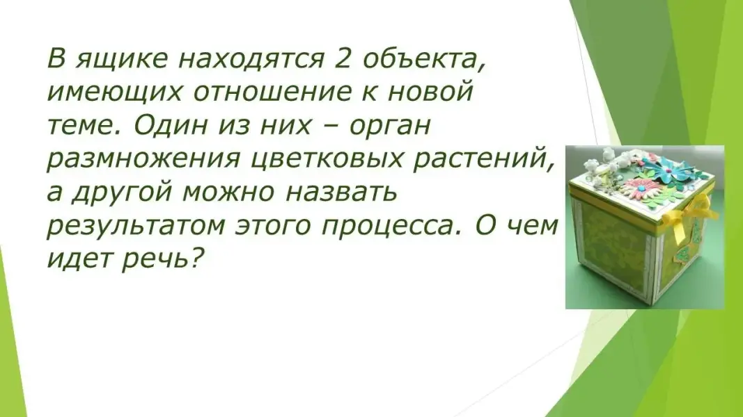 Слайд № 12 В ящике находятся 2 объекта, имеющих отношение к новой теме. Один из них - орган размножения цветковых растений, а другой можно назвать результатом этого процесса. О чем идет речь?