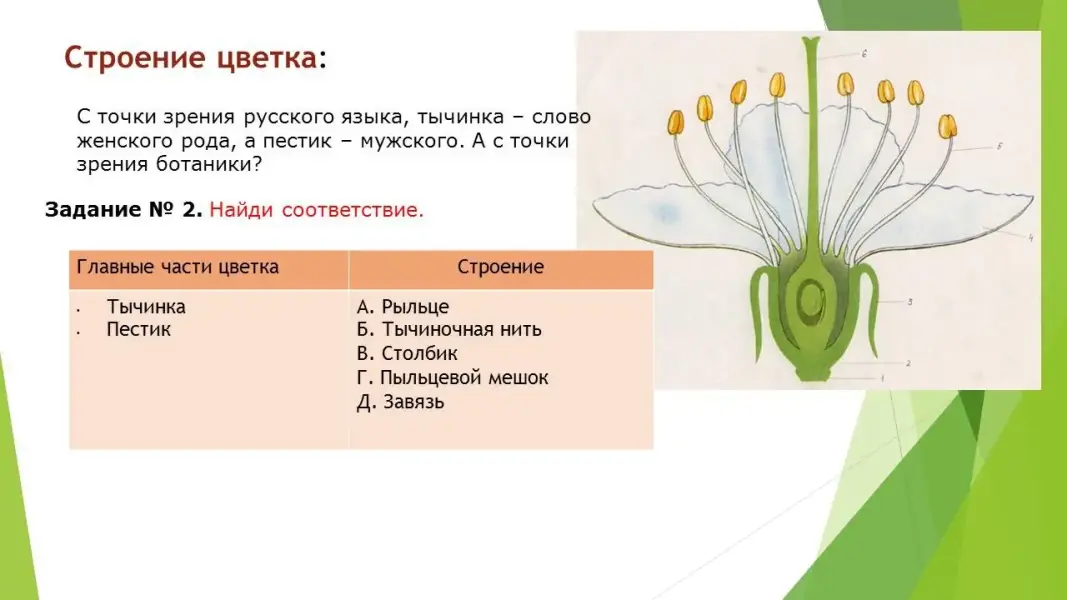 Б. Тычиночная нить В. Столбик Г. Пыльцевой мешок Д. Завязь |