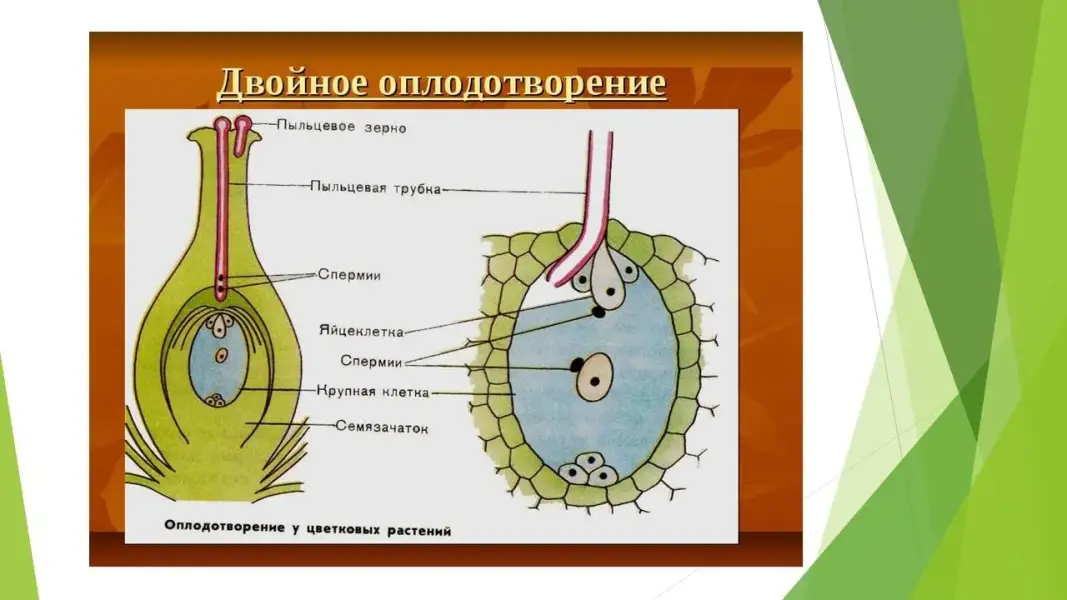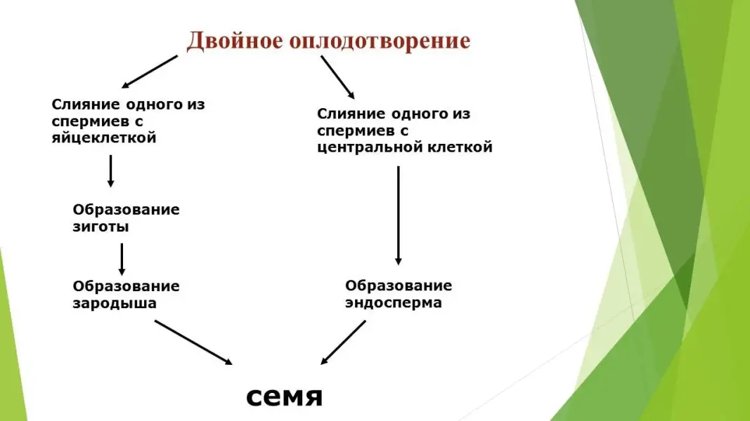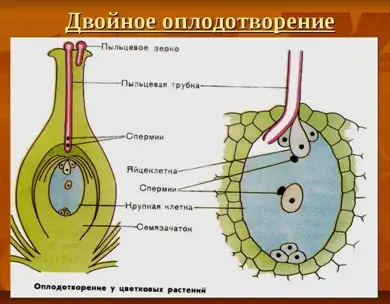 - Спермии попадают в завязь пестика. Один спермий сливается с яйцеклеткой, а второй с центральной клеткой. Такой вид оплодотворения называется двойным и характерен для всех цветковых растений, кроме орхидей.