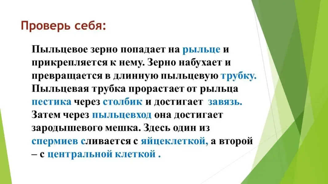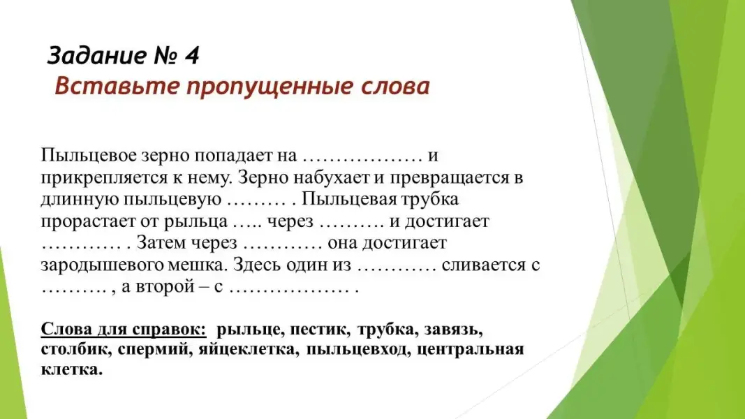 Слова для справок: рыльце, пестик, трубка, завязь, столбик, спермий, яйцеклетка, пыльцевход, центральная клетка.
