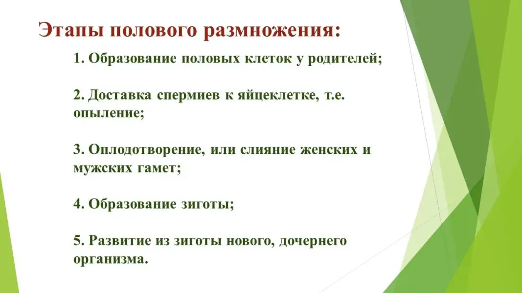 | 2. Половое размножение | Б. Развитие новой особи из зиготы, образующейся в результате оплодотворения |