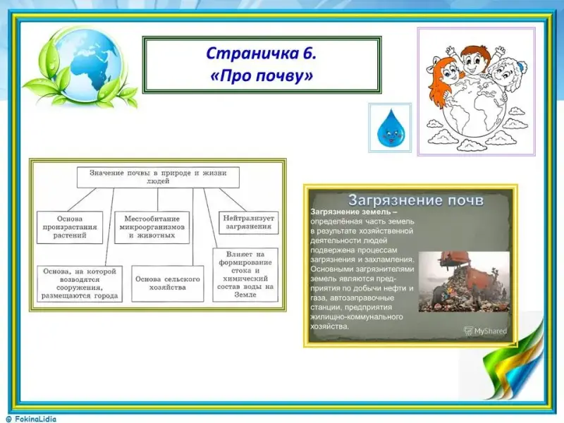 Учитель: Почва образуется очень медленно. Сантиметр почвы образуется в природе за 250-300 лет. Слой в 20 см за 5-6 тысяч лет. Поэтому к почве надо относится бережно. Часто человек наносит вред почве. Во время строительства нарушается верхний слой почвы. Во время испытания различных видов оружия на полигонах земля заражается радиоактивными отходами. Уничтожая леса, человек обедняет почву, делает ее мертвой. Даже вы, не подозревая об этом, вредите почве, когда разводите костры. Человек, понимая, что наносит вред почве, вынужден о ней заботиться. Что же делают люди?