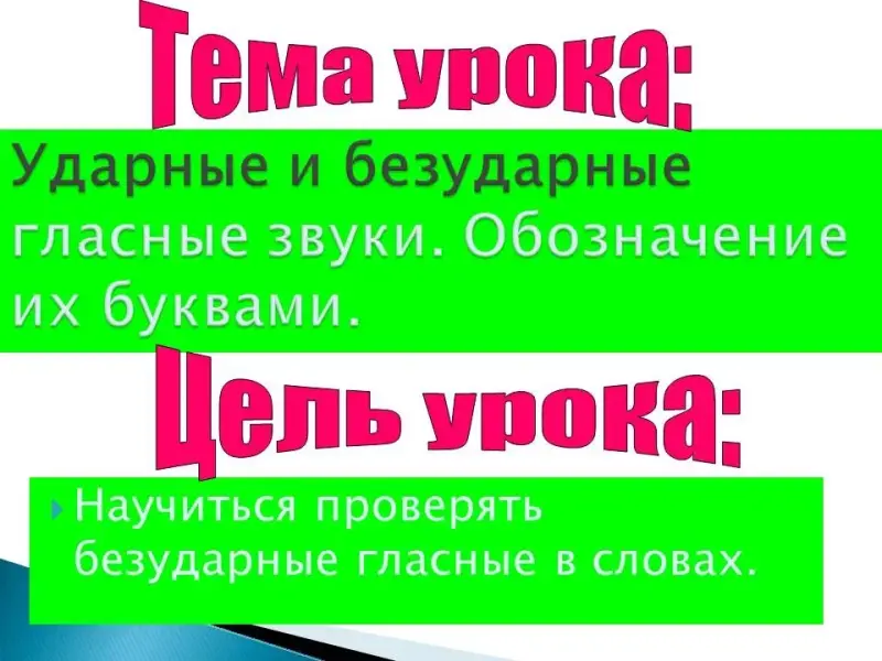 (Будем учиться находить ударные и безударные гласные звуки; наблюдать за расхождением между произношением и написанием слова; учиться проверять безударный гласный звук и писать нужную гласную)