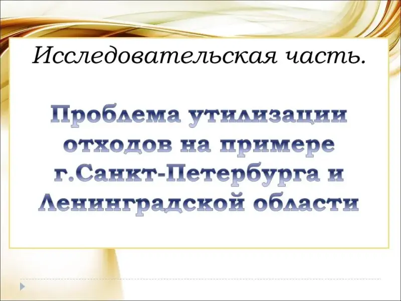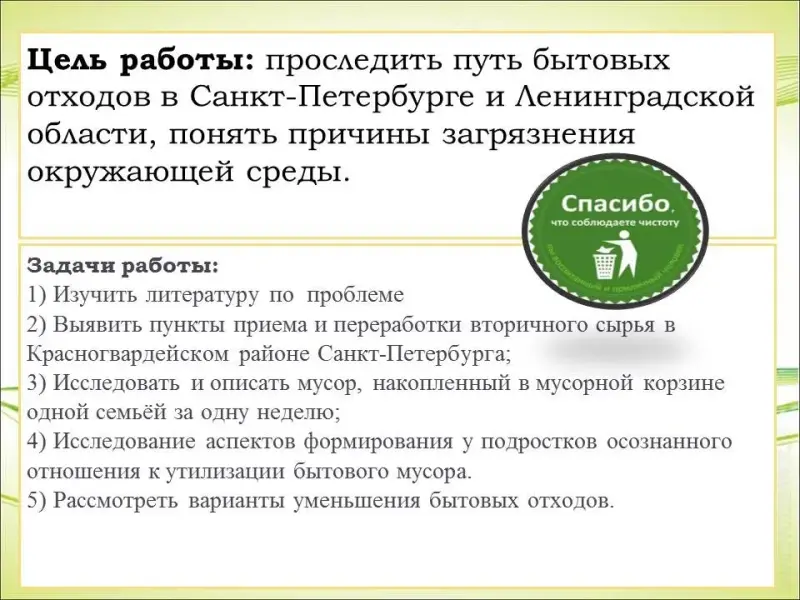 Цель работы: проследить путь бытовых отходов в Санкт-Петербурге и Ленинградской области, понять причины загрязнения окружающей среды. (Презентация, слайд 3)