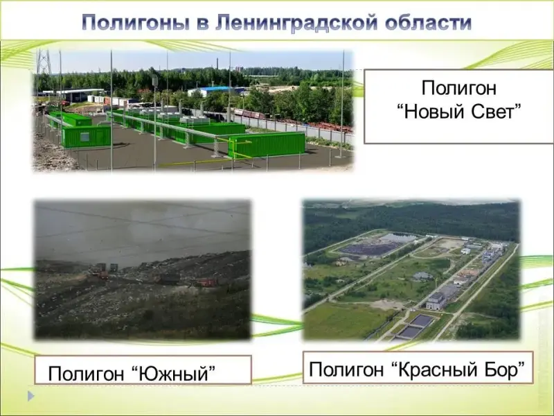 Мусор, накапливающийся с каждым годом, является серьезной проблемой Санкт-Петербурга и Ленинградской области. Мощности новейших технологий хватает лишь для переработки 5 % областного и 15 % городского мусора.(Презентация, слайд 10) Жизнь в Ленинградской области ежегодно проходит с образованием 4,3 млн.м3 мусора, 95 % которых сжигается и захоранивается.Многие полигоны находятся в антисанитарийном состоянии, что составляет дискомфорт жителям на прилежащих территориях. Примером является самая большая свалка в Ленинградской области в Ломоносовском районе - полигон "Южный".Благодаря полигонам "Новый Свет" и "Красный Бор" Ленинградская область в рейтинге экологов по всей России заняла 83 место с конца из 85 возможных.