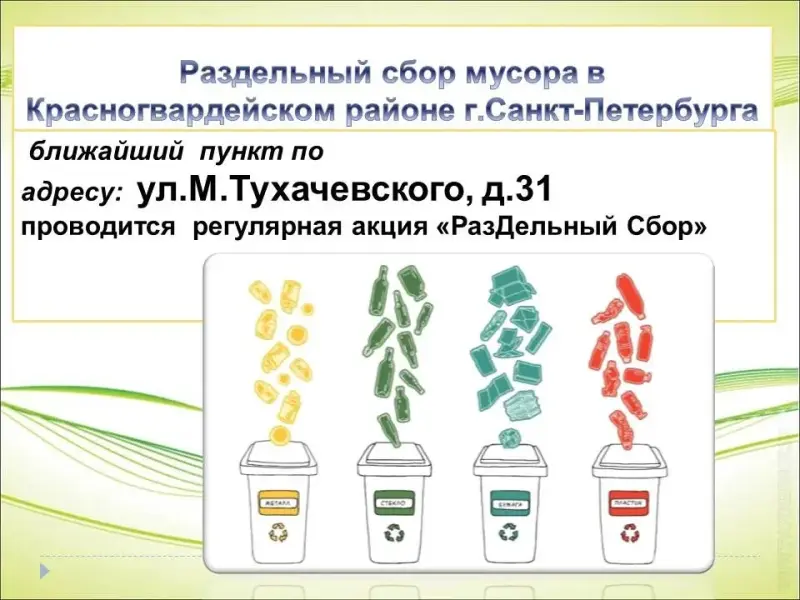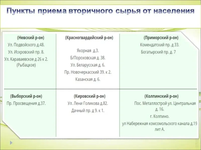 2) Выявить пункты приема и переработки вторичного сырья в Красногвардейском районе Санкт-Петербурга;