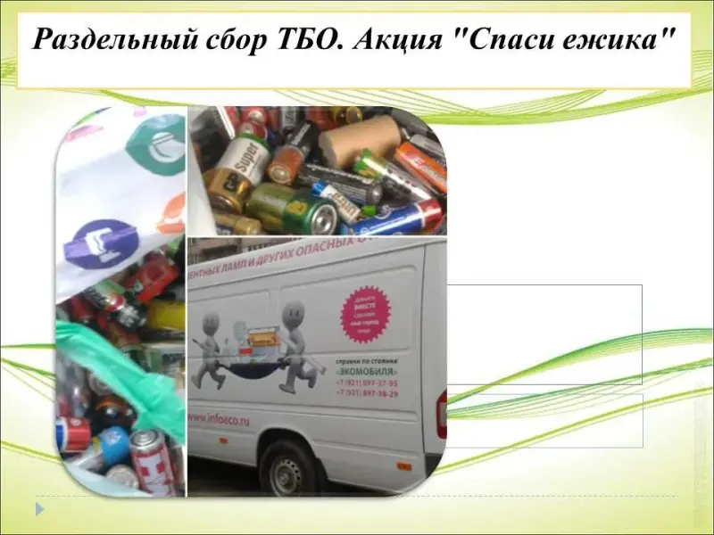 4. Раздельный сбор ТБО. Акция "Спаси ежика", сбор использованных батареек. Конкурс поделок из пластиковой посуды " Необычное в обычном". Всероссийский экоурок "Разделяй с нами" для школьников 7 -11