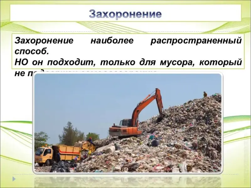Захоронение наиболее распространенный способ. Он подходит, только для мусора, который не подвержен самовозгоранию. В наши дни обычные свалки уступают место полигонам, оснащенных