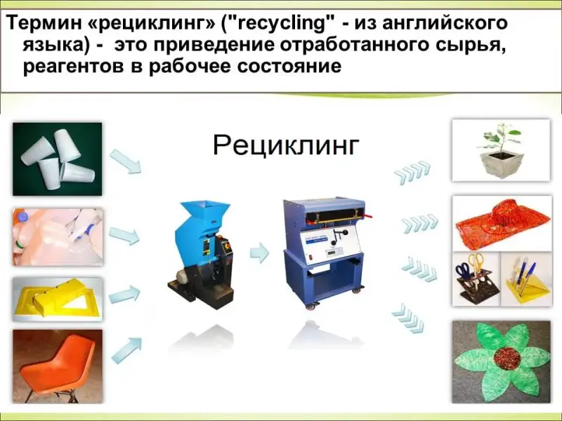 Термин «рециклинг» ("recycling" - из английского языка) - это приведение отработанного сырья, реагентов в рабочее состояние. Это повторное использование или возвращение в оборот