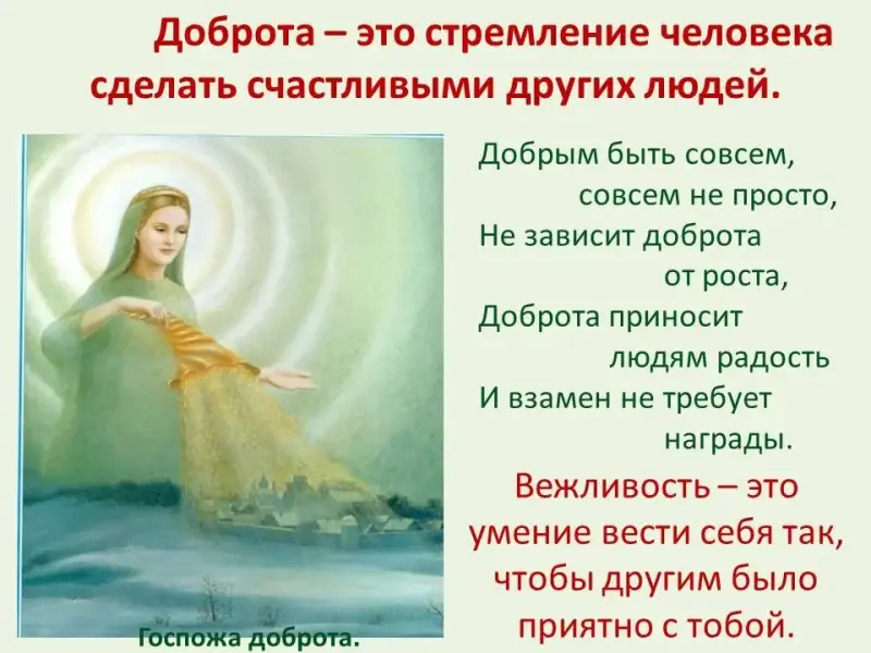 Госпожа Доброта -"Не ищи красоты, а ищи доброты" - это правило вывели наши предки. И при этом добавляли "Мир не без добрых людей". Они были уверены, что доброта происходит от любви; любви к человеку и доброта направлена на окружающих людей, любви к природе и тогда доброта направлена на всё живое, что окружает нас.