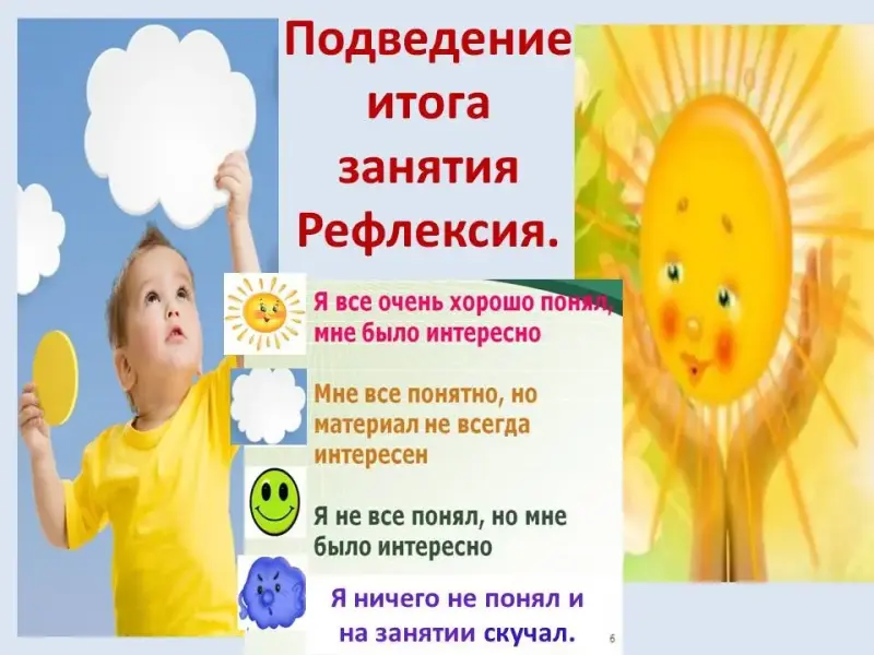 - Я хочу, чтобы вы сами дали оценку нашему занятию. Перед вами лежат солнышки и белые тучки, зелёные смайлики и темно-синие тучи.