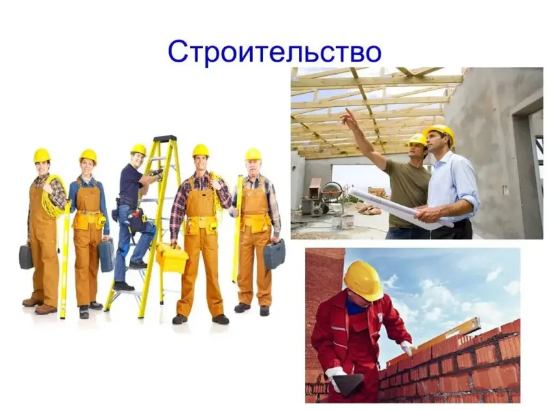 Строительство (каменщик, сварщик, экскаваторщик, маляр, штукатур, плотник, крановщик, водитель)