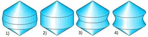 В одном из учебно-тренировочных тестов для подготовки к ЕГЭ по математике, я встретил простой, на первый взгляд, вопрос: какая фигура получится при вращении куба вокруг его диагонали? В качестве возможных вариантов ответа предлагались четыре фигуры вращения на рисунке 1. Ученику в ответе достаточно было указать только номер фигуры. Попробуйте проверить своё пространственное мышление и выбрать нужную фигуру.