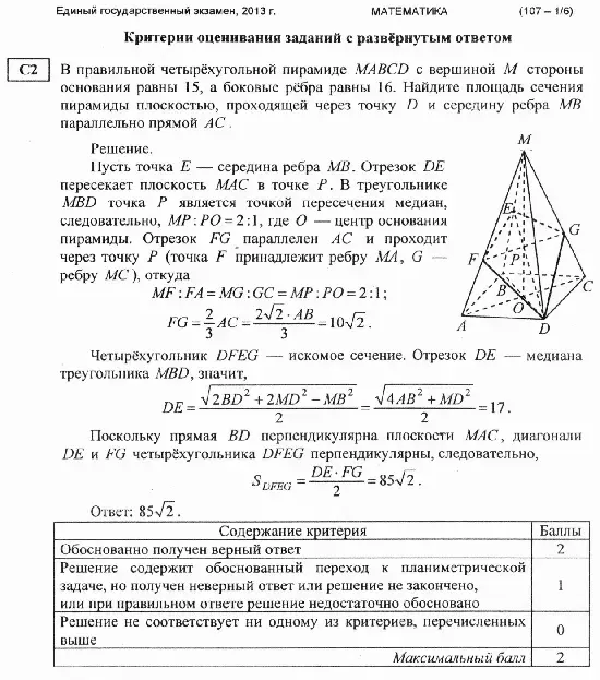 Задача С2. В правильной четырехугольной пирамиде МАВСD с вершиной М стороны основания равны 15, а боковые ребра равны 16. Найдите площадь сечения пирамиды плоскостью, проходящей через точку D и середину ребра МВ параллельно прямой АС.
