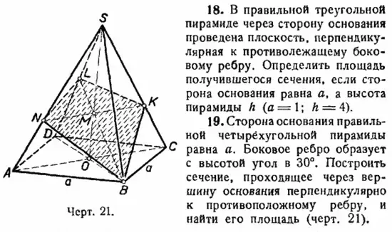 Ни чем не примечательная задача на построение сечения пирамиды плоскостью и вычисление площади этого сечения. Но это взгляд учителя молодого поколения! Учитель же старшего поколения может по-другому взглянуть на эту задачу. Лично мне эта задача напомнила задачу из школьного учебника нашей юности. Не поленился, нашел сборник Н.А. Рыбкина 1970 года издания, по которому я учился решать стереометрические задачи. Листая пожелтевшие станицы этого сборника, о, чудо, нашел задачу №19 параграф 10, чертеж и формулировка практически совпадают с задачей ЕГЭ 2013 года. Вот уж неожиданная встреча более чем через 40 лет, подтверждающая фразу, что "всё новое - это хорошо забытое старое". Задачи хотя и разного направления, в одной требуется построить сечение, а во второй вычислить площадь такого сечения, но согласитесь, что речь идет об одном и том же.