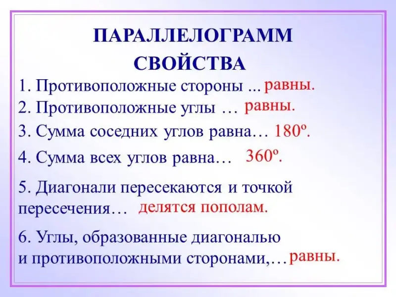 Знать свойства параллелограмма. Уметь доказывать свойства 1-7 (приложение 3).