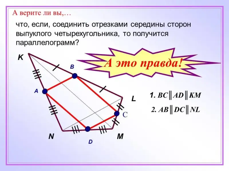 Задача 7. А верите ли вы,... что, если, соединить отрезками середины сторон выпуклого четырехугольника, то получится параллелограмм? (верно, доказательство приведем позже)