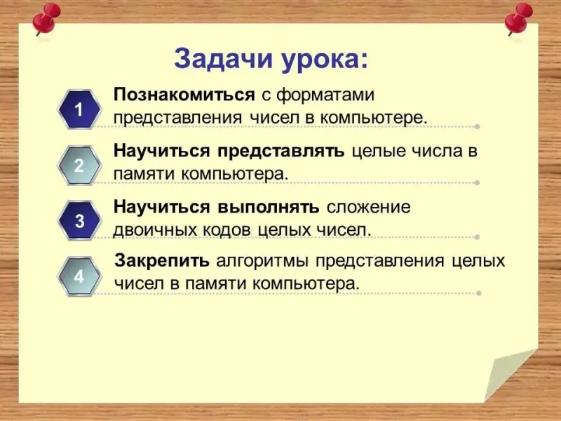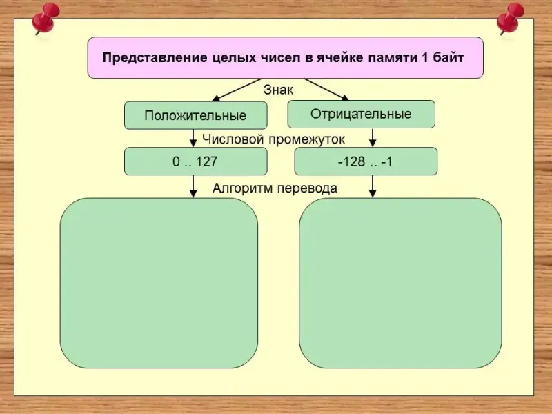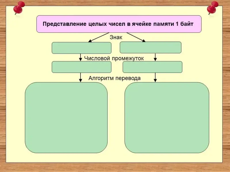 - образовательные: научить представлять целые числа в памяти компьютера, используя знания пройденного материала по информатике и математике, научить решать примеры по представлению целых чисел и выполнению операций над ними, используя ячейку памяти 1 байт, заполнить схему с алгоритмами действий над целыми числами;