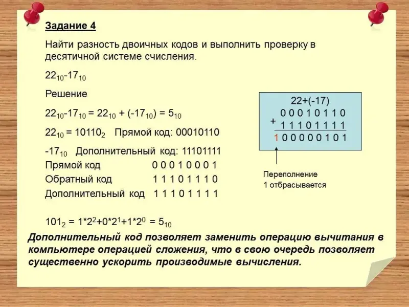 Найти разность двоичных кодов и выполнить проверку в десятичной системе счисления. 2210-1710