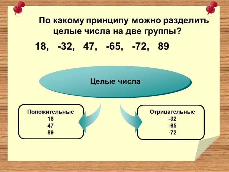 По какому принципу можно разделить целые числа на две группы: 18, -32, 47, -65, -72, 89? (Слайд 7)