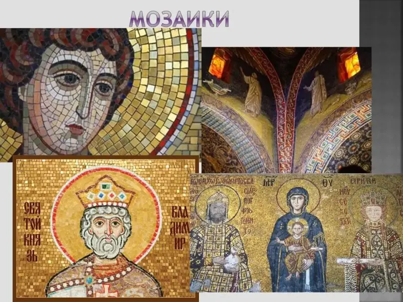 Украшением храма были иконы. Они писались на дереве (сухих, в течение нескольких лет выдержанных досках). На деревянную основу накладывали холст, на него накладывался слой мела, по которому писали красками. Среди древнейших икон выделяется икона Владимирская Богоматерь византийского происхождения. Эта икона является главной святыней России. Была широко известна на Руси. Обратив взор к матери, ребенок обнимает её за шею. Взгляд матери полон скорби.