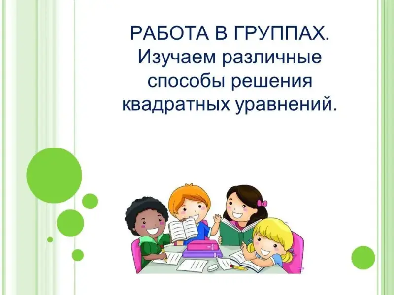 - работа в группах по изучению других новых способов решения квадратных уравнений