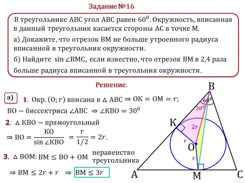 а) Докажите, что отрезок ВМ не больше утроенного радиуса вписанной в треугольник окружности.
