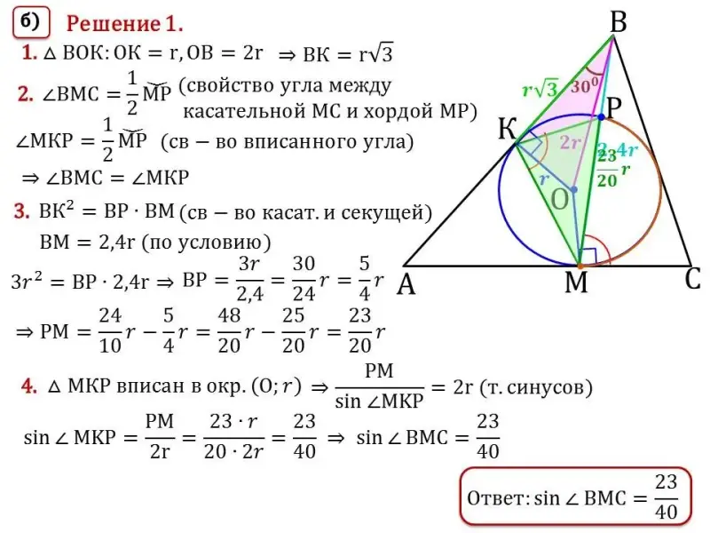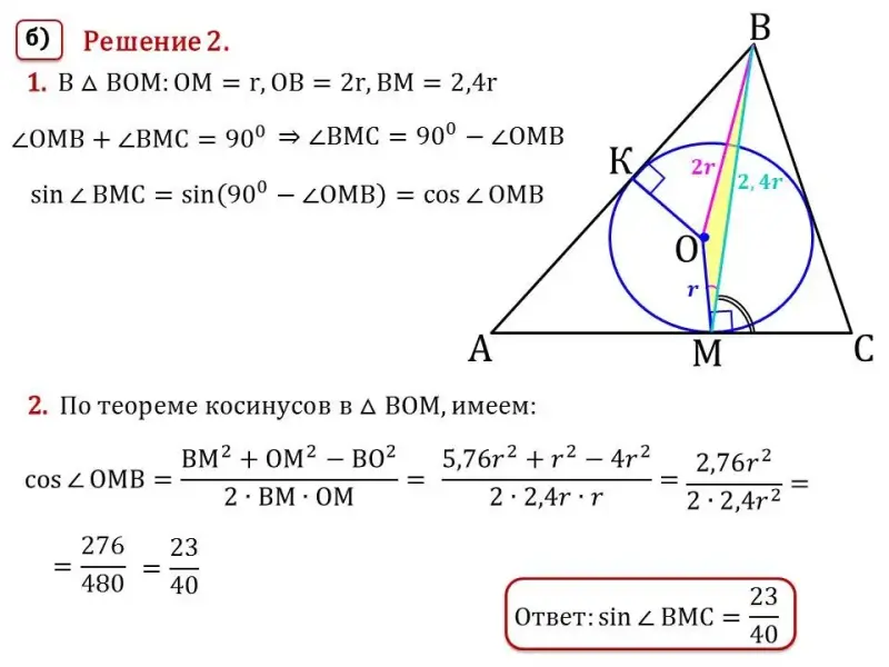 б) Найдите синус угла ВМС, если известно, что отрезок ВМ в 2,4 раза больше радиуса вписанной в треугольник окружности.