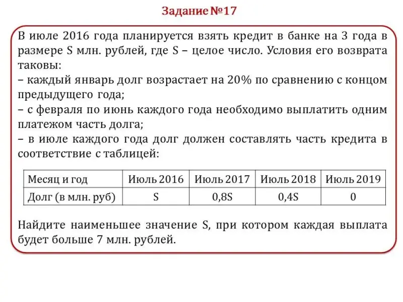 Найдите наименьшее значение S, при котором каждая выплата будет больше 7 млн. рублей.