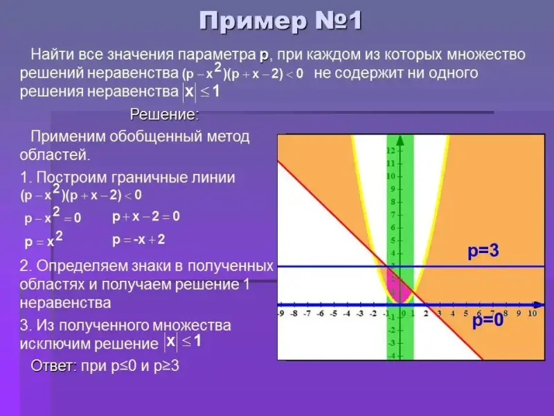 Метод областей особенно полезен при решении уравнений или неравенств с параметром. Применение метода интервалов в таких случаях затруднено, так как взаимное расположение точек, отмечаемых на числовой