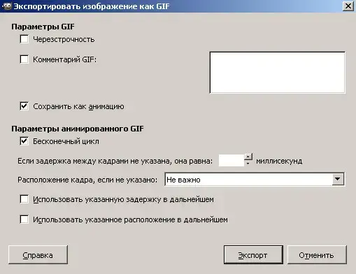 - Сохраните полученное изображение как GIF-анимацию с помощью команды Файл - Export As... В появившемся диалогом окне Экспорт изображения выберите Изображение GIF(*.gif) и укажитеимя файла Механизм дыхания.gif. Нажмите кнопку Экспортировать. В диалоговом окне Экспортировать изображение как GIF (рис. 3) укажите Сохранить как анимацию, выберите пункт Бесконечный цикл. Рассчитайте и задайте задержку в миллисекундах, соответствующую дыханию человека в состоянии покоя. Нажмите кнопку Экспорт.