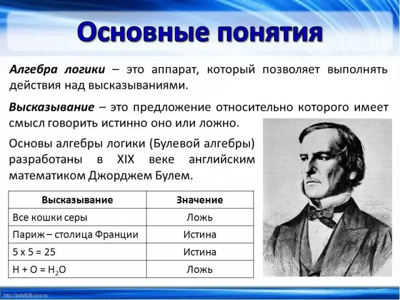 В основе построения компьютера лежат логические элементы. Для понимания принципа их работы начнём знакомство с основными понятиями алгебры логики.