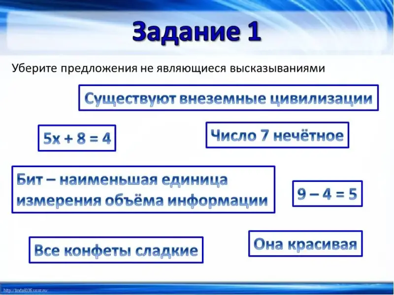 Но не все выражения можно назвать высказываниями. (Слайд 4) В этом задании вам предлагается убрать предложения, которые не являются высказываниями (при нажатии ПКМ на ненужных предложениях они исчезают).