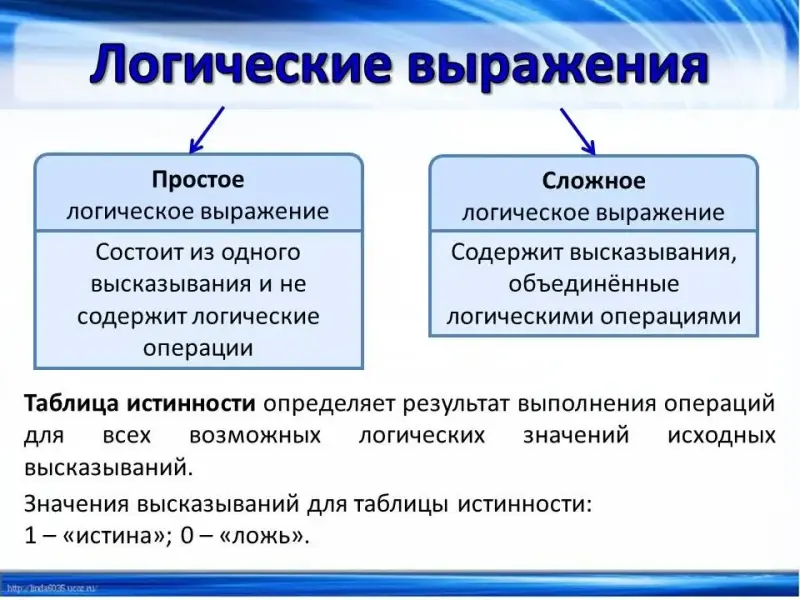 (Слайд 5) Логические выражения могут быть простыми или сложными. Простое логическое выражение состоит из одного высказывания и не содержит логические операции. Сложное логическое выражение содержит высказывания, объединённые логическими операциями. Чтобы увидеть результат выполнения логических операций для всех исходных данных, нужно построить таблицу истинности. При составлении таблицы истинности будем обозначать "истину" - 1, а "ложь" - 0.