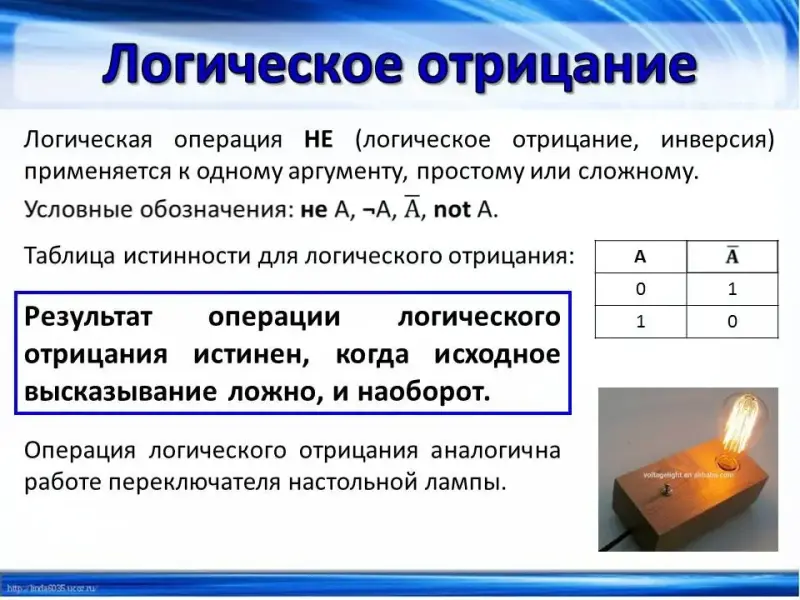 (Слайд 6) Логическая операция НЕ (логическое отрицание, инверсия) применяется к одному аргументу, простому или сложному. Условные обозначения и таблица истинности для операции логического отрицания представлены на слайде. Результат операции истинен, когда исходное высказывание ложно, и наоборот. Операция логического отрицания аналогична работе переключателя настольной лампы.