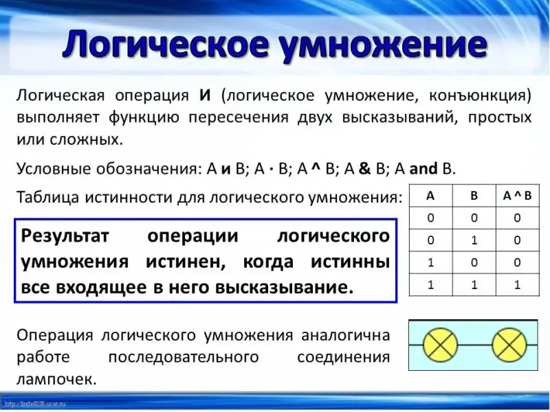 (Слайд 8) Логическая операция И (логическое умножение, конъюнкция) выполняет функцию пересечения двух высказываний, простых или сложных. Условные обозначения и таблица истинности для операции логического умножения представлены на слайде. Результат операции логического умножения истинен, когда истинны се входящие в него высказывания. Операция логического умножения аналогична работе последовательного соединения лампочек.