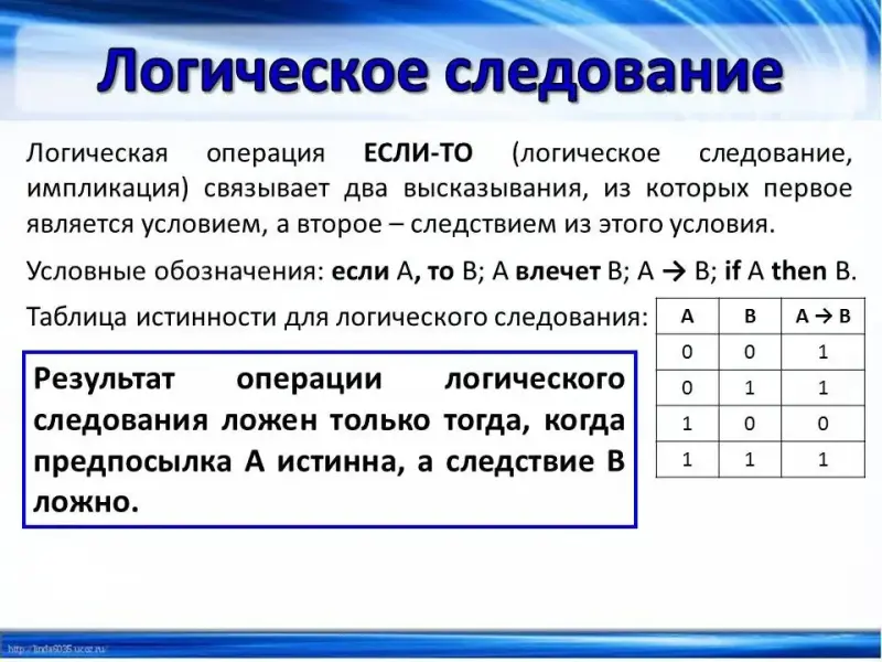 (Слайд 10) Логическая операция ЕСЛИ-ТО (логическое следование, импликация) связывает два высказывания, из которых первое является условием, а второе - следствием из этого условия. Условные обозначения и таблица истинности для операции логического умножения представлены на слайде. Результат операции логического следования ложен только тогда, когда предпосылка А истинна, а следствие В ложно.