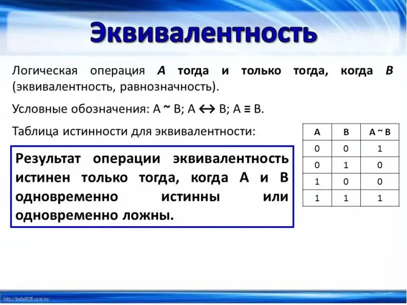 (Слайд 11) Логическая операция А тогда и только тогда, когда В (эквивалентность, равнозначность). Условные обозначения и таблица истинности для операции логического умножения представлены на слайде. Результат операции эквивалентность истинен только тогда, когда А и В одновременно истинны или одновременно ложны.