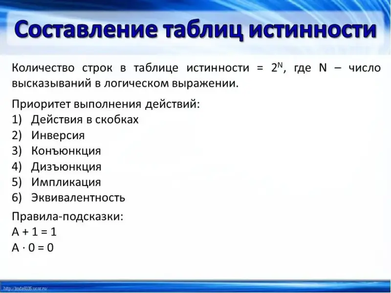 (Слайд 12) С помощью таблиц истинности можно проверить истинность любых сложных высказываний. При составлении таблиц нужно придерживаться некоторых правил. Количество строк в таблице истинности = 2N, где N - число высказываний в логическом выражении. Приоритет выполнения логических операций следующий: инверсия, конъюнкция, дизъюнкция, и т.д. Но с помощью скобок можно изменить приоритет выполнения операций. А также при составлении таблиц истинности можно применять правила-подсказки: А + 1 = 1; А x 0 = 0.