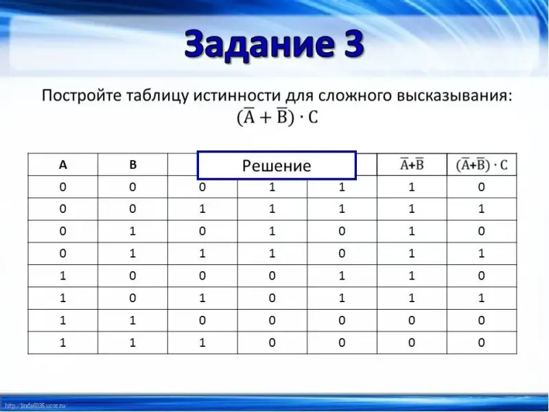 (Слайд 15) А теперь самостоятельно выполните задание. Постройте таблицу истинности для логического выражения: