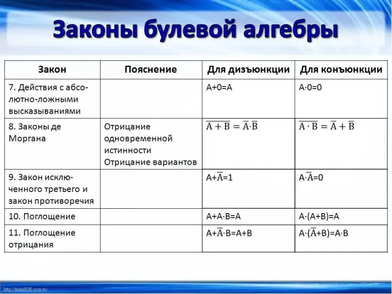 (Слайд 16-17) Упростить сложные логические выражения помогают законы булевой алгебры. Некоторые из них приведены на слайдах.