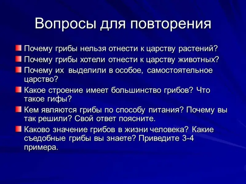 - Каково значение грибов в жизни человека? Какие съедобные грибы вы знаете? Приведите 3-4 примера. (Слайд №11)